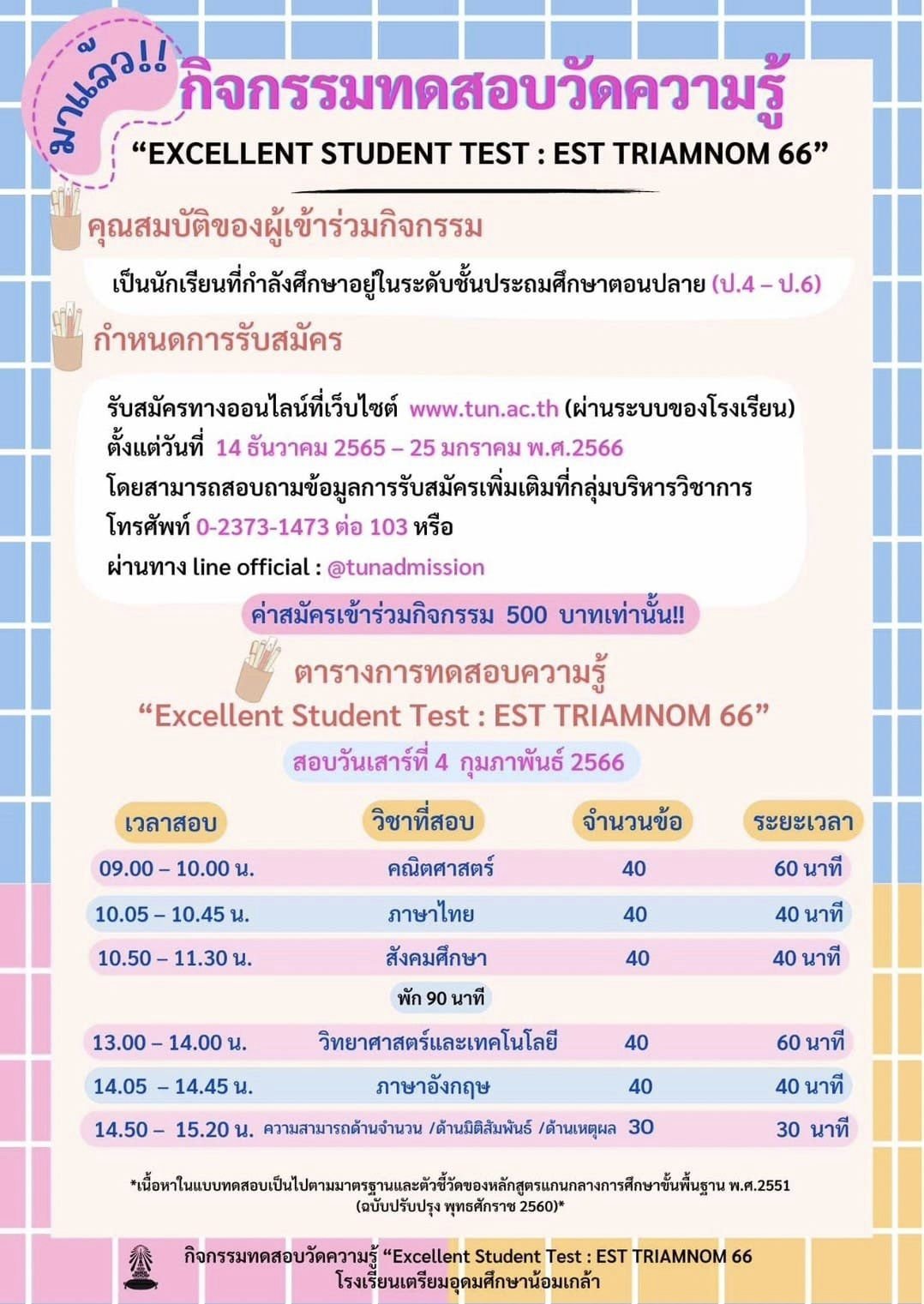 โรงเรียนเตรียมอุดมน้อมเกล้า (เตรียมน้อมฯ) รับสมัครน้องๆ ป.4 ป.5 ป.6 เข้าร่วมกิจกรรมทดสอบวัดความรู้ ประจำปี 2566 แล้วนะคะ