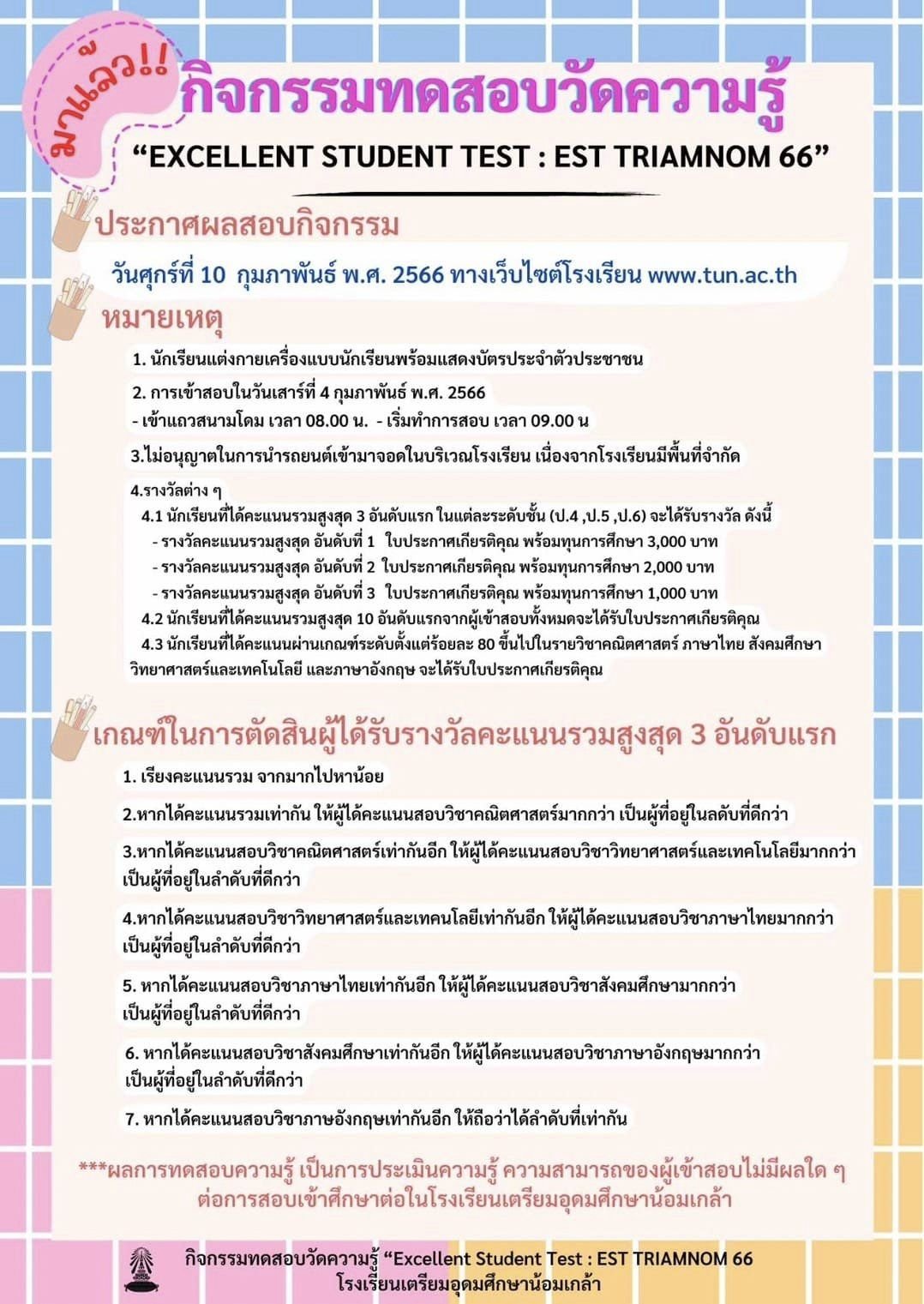 ดูรายละเอียดเพิ่มเติมได้ที่เพจของทางโรงเรียน : งานประชาสัมพันธ์ รร.เตรียมอุดมศึกษาน้อมเกล้า | Bangkok | Facebook