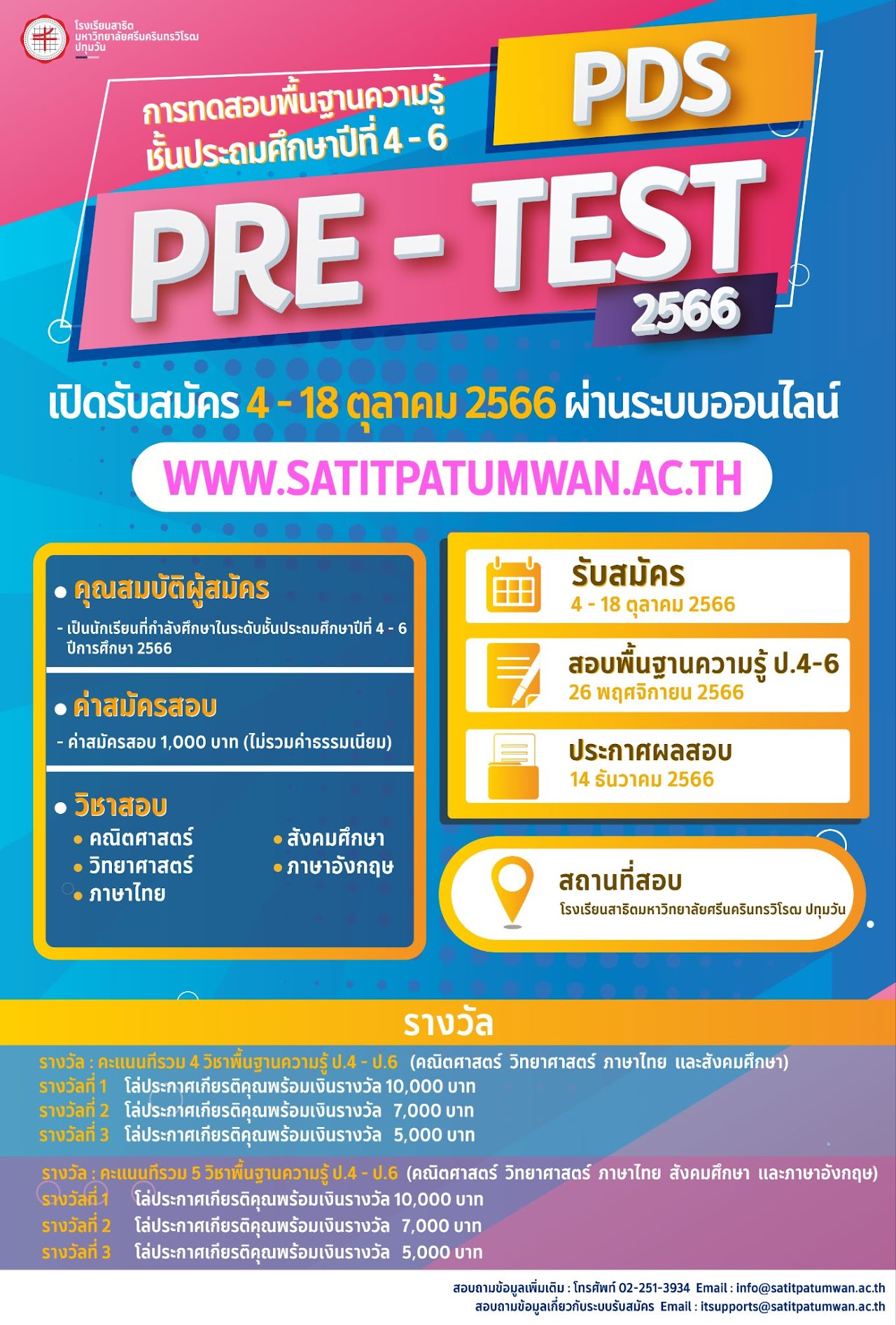 ดูรายละเอียดเพิ่มเติมได้ที่ >> Patumwan Demonstration School - Pre-test 2566 (satitpatumwan.ac.th)