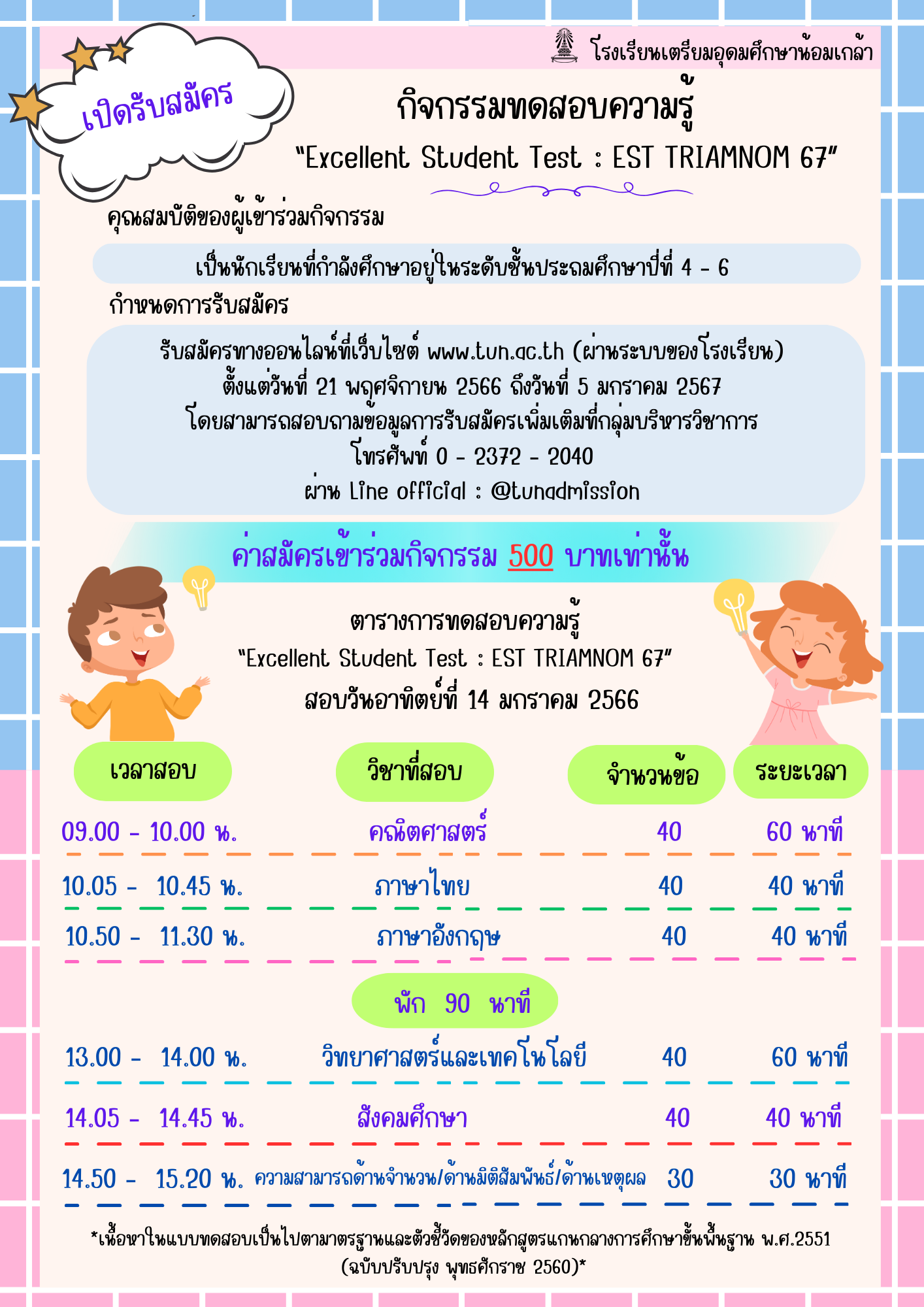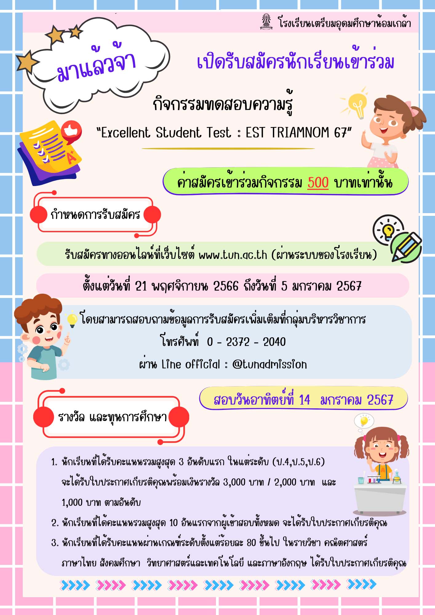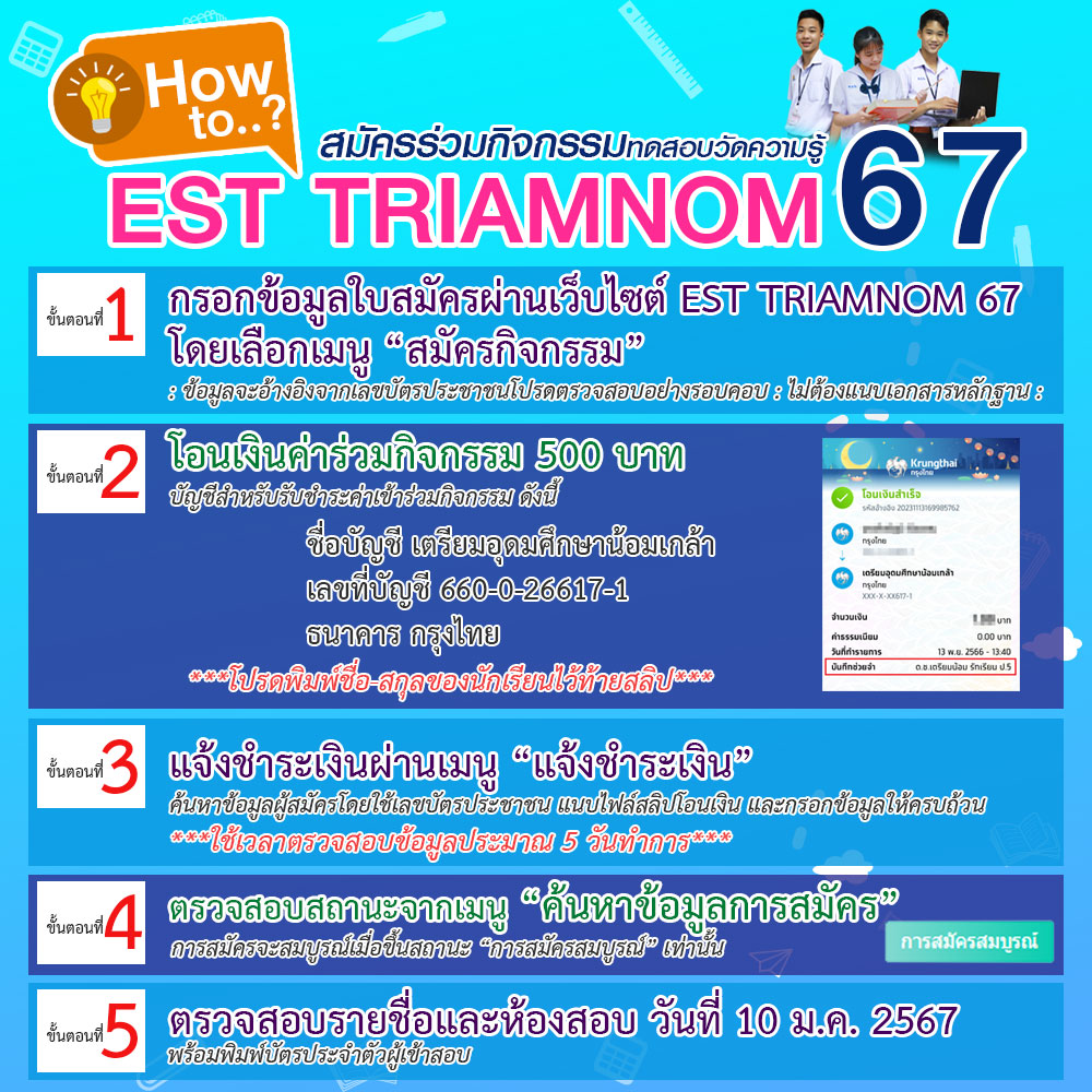ดูรายละเอียดเพิ่มเติมได้ที่เพจของทางโรงเรียน : กิจกรรมทดสอบวัดความรู้ “Excellent Student Test : EST TRIAMNOM 67 (tun.ac.th)