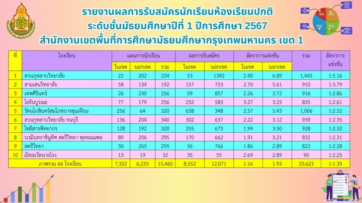 เปิด 10 อันดับโรงเรียนยอดนิยม กทม.ที่มีผู้สมัครเข้า ม.1 และ ม.4 มากที่สุด ปีการศึกษา 2567 “สวนกุหลาบ-หอวัง-โพธิสาร” อัตราการแข่งขันสูงสุด