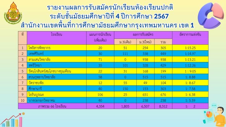 โดยโรงเรียนยอดนิยม 10 อันดับแรกที่มีผู้สมัคร ม.1 มากที่สุด ได้แก่