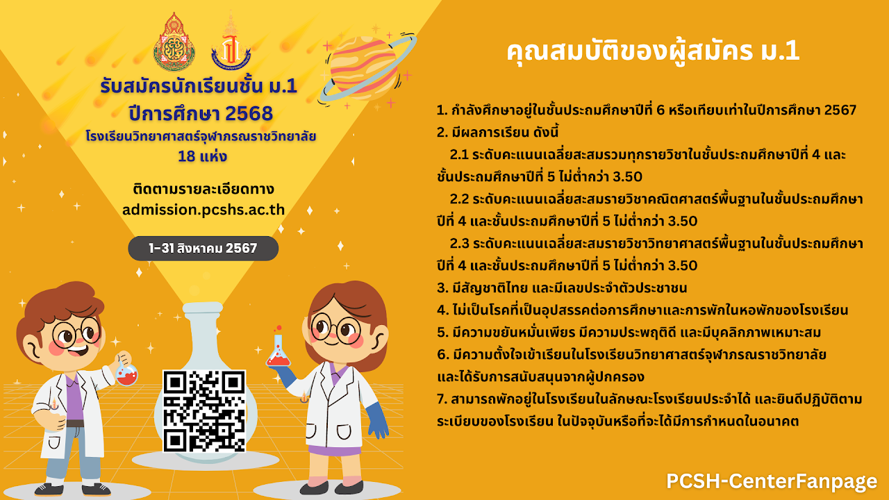 เว็บไซต์งานรับนักเรียน เครือข่ายสถานศึกษากลุ่มโรงเรียนวิทยาศาสตร์จุฬาภรณราชวิทยาลัย >> https://admission.pcshs.ac.th/