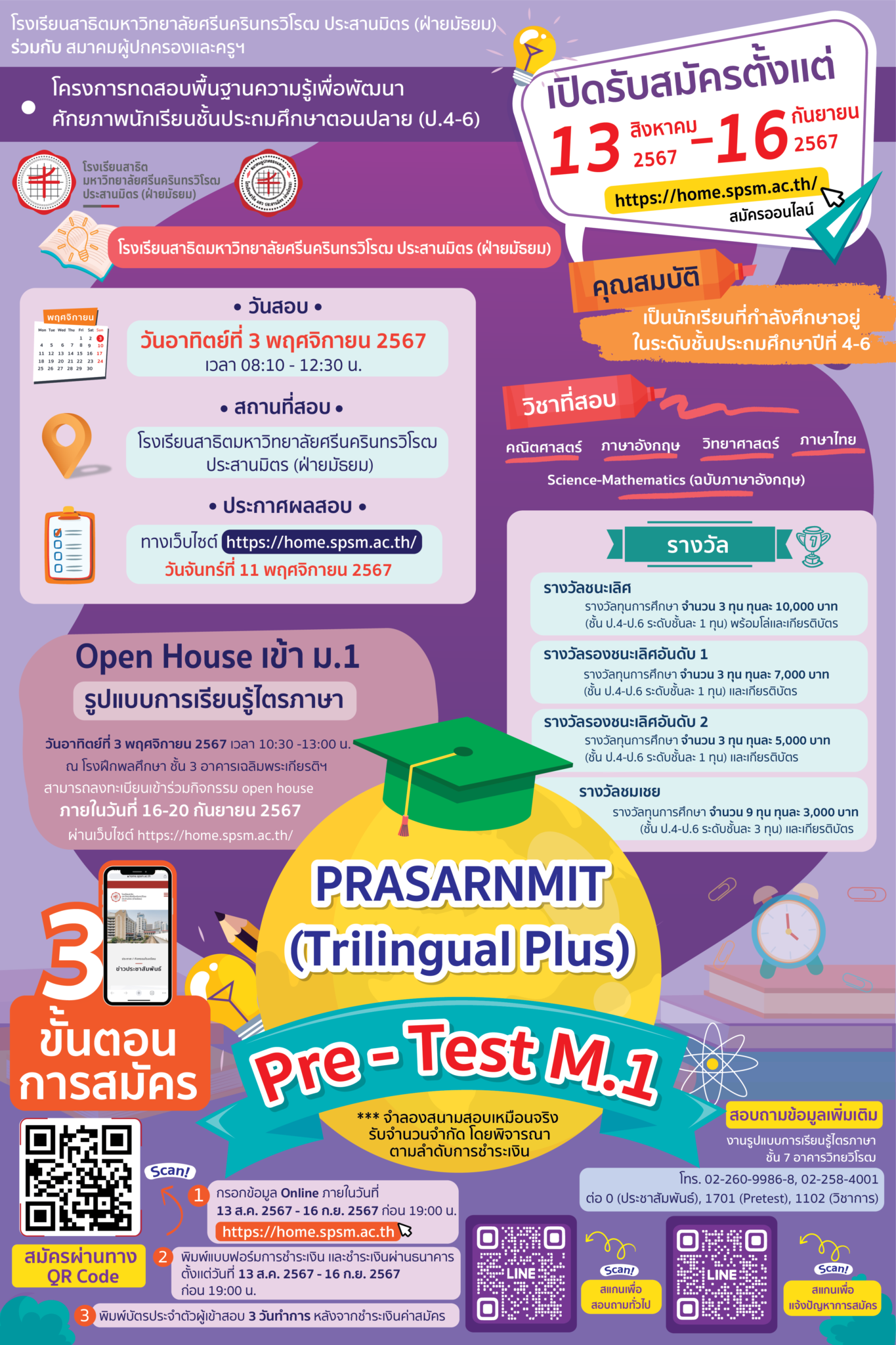 ดูรายละเอียดเพิ่มเติมได้ที่ >> โครงการทดสอบพื้นฐานความรู้เพื่อพัฒนาศักยภาพนักเรียน ชั้นประถมศึกษาตอนปลาย (ป.4-6) Trilingual Plus & Tri-S Pre-Test M.1 – โรงเรียนสาธิต มศว ประสานมิตร (ฝ่ายมัธยม) (spsm.ac.th)