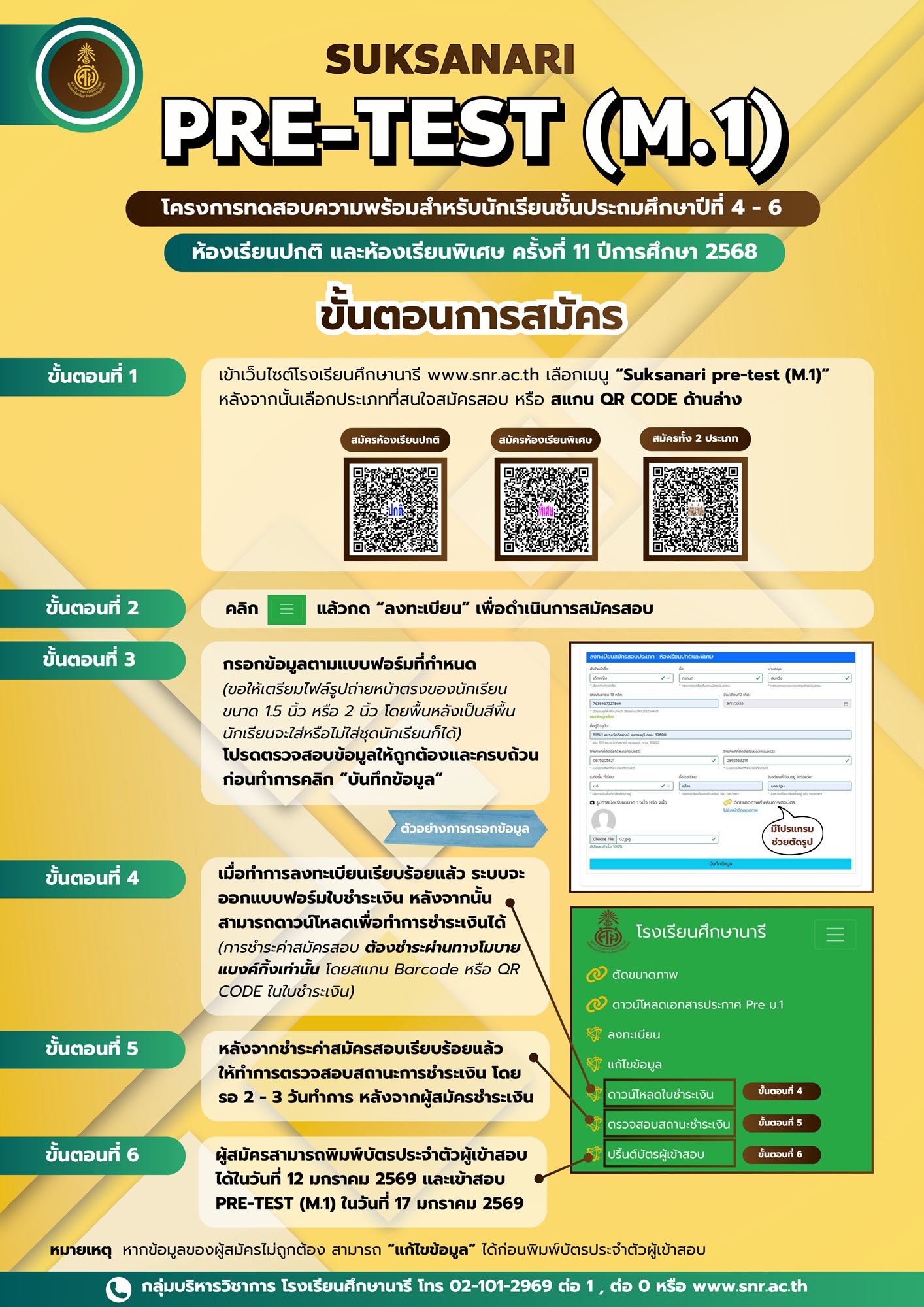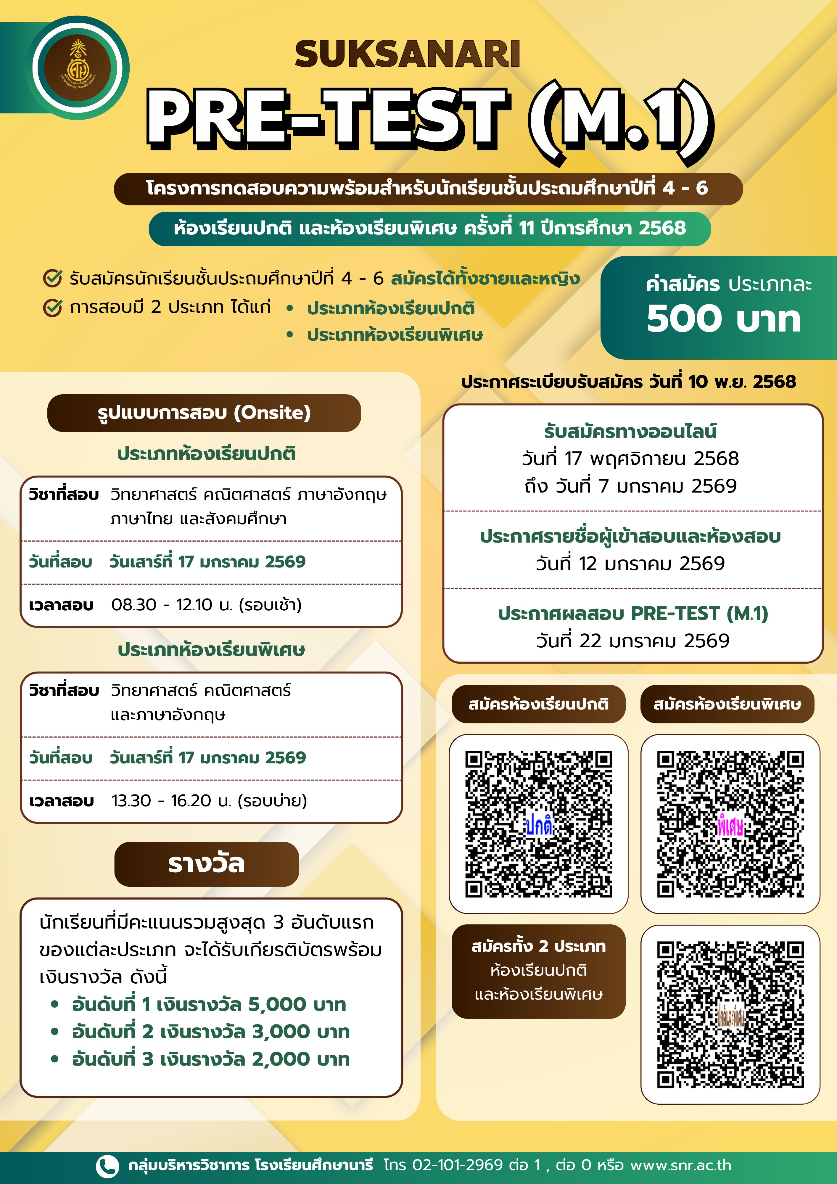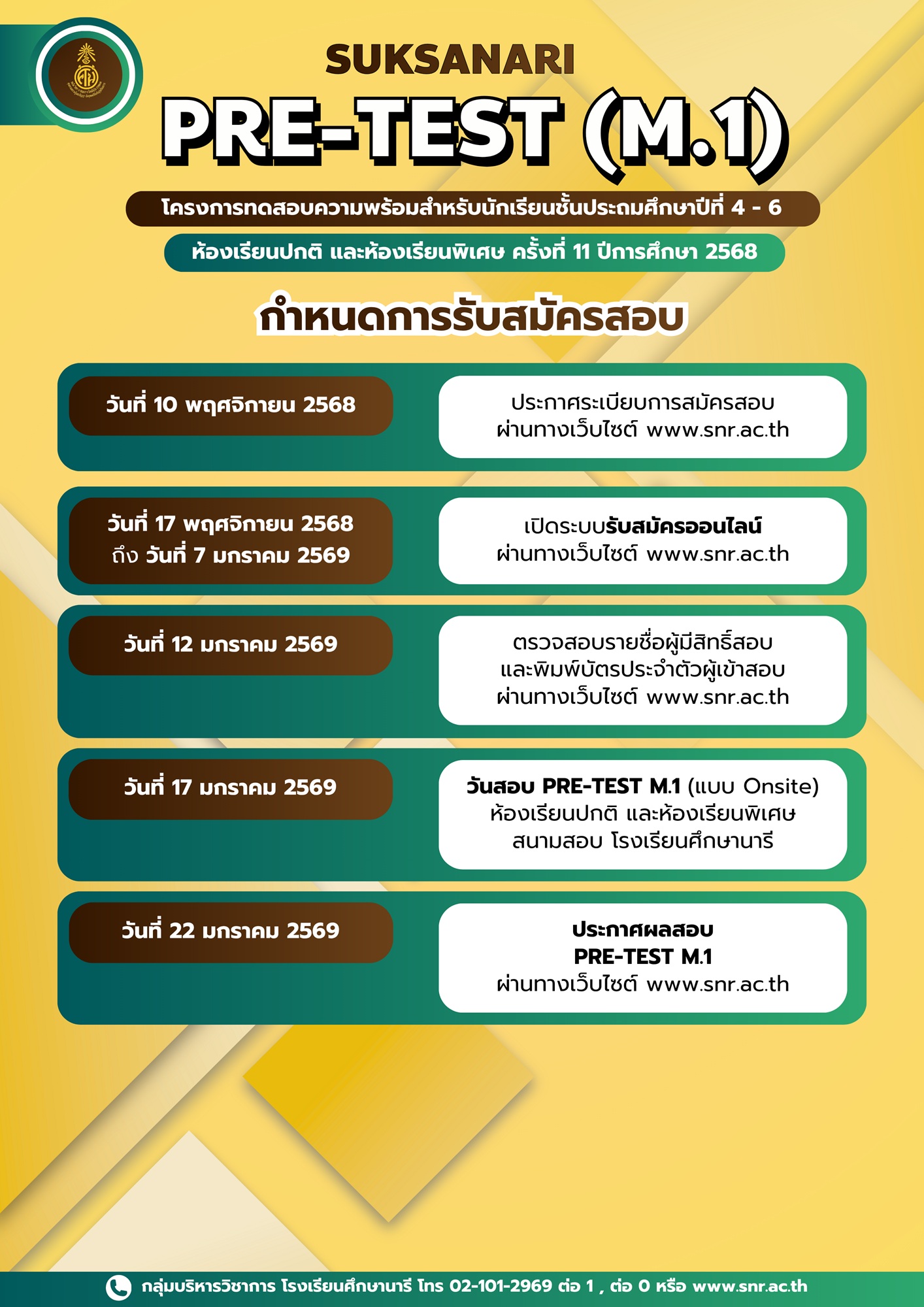 ดูรายละเอียดเพิ่มเติมได้ที่ >> ประกาศ รับสมัครโครงการทดสอบความพร้อมสำหรับนักเรียน Pre-Test (M.1) ครั้งที่ 11 ปี 2568