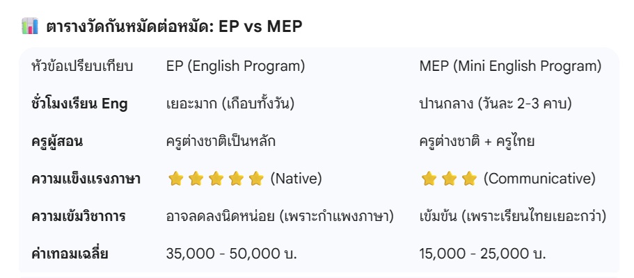 - ทีม MEP: ถ้าเป้าหมายคือ "อยากให้ลูกมีพื้นฐานภาษาดีกว่าเด็กทั่วไป แต่ยังเน้นสอบเข้ามหาลัยไทย/หมอ/วิศวะ" MEP คือทางสายกลางที่น่าสนใจมากค่ะ เพราะได้ทั้งภาษาและวิชาการแน่นๆ แถมประหยัดเงินได้เยอะ