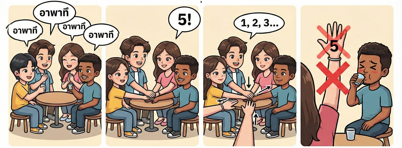 มือใครที่วางทับแล้วตรงกับเลขที่ประกาศ (เช่น มือที่ 5) คนนั้น แพ้! (และต้องดื่ม)