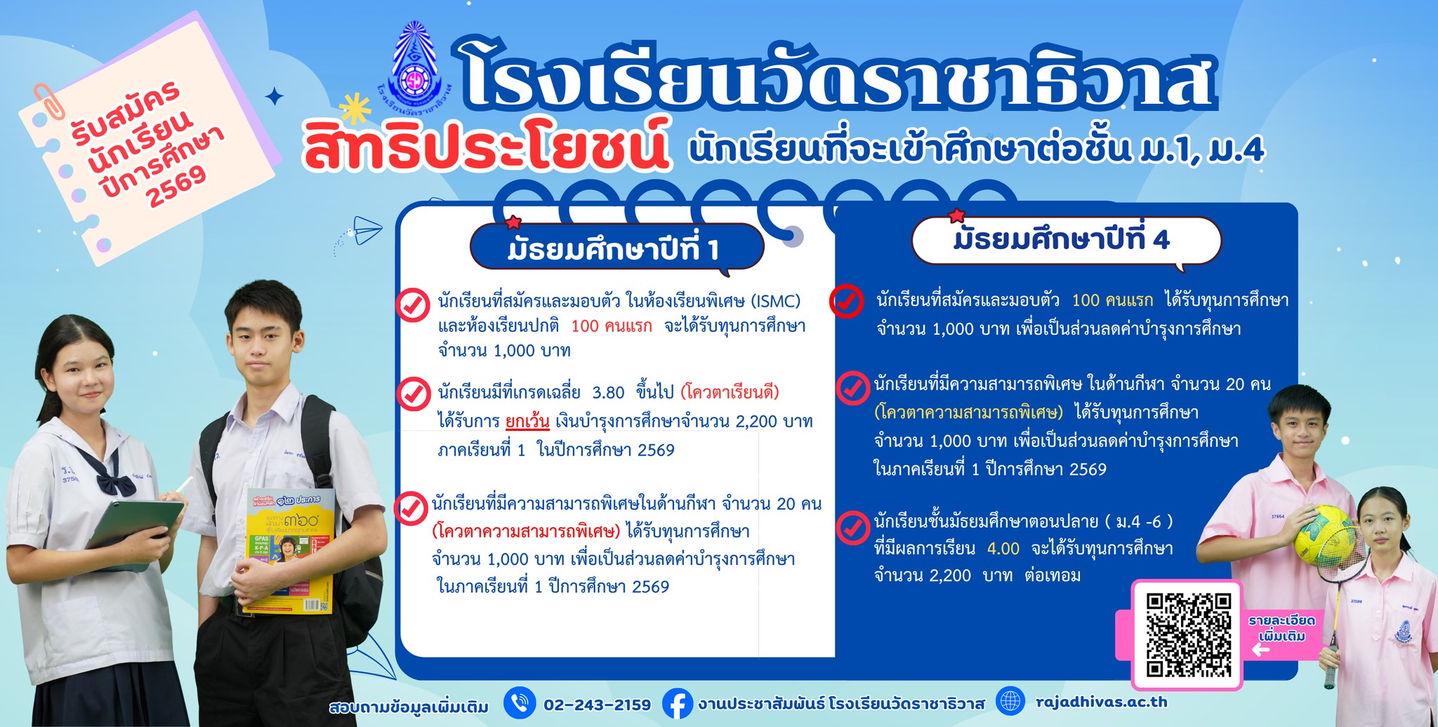 ดูรายละเอียดเพิ่มเติมได้ที่ >> งานประชาสัมพันธ์ โรงเรียนวัดราชาธิวาส
