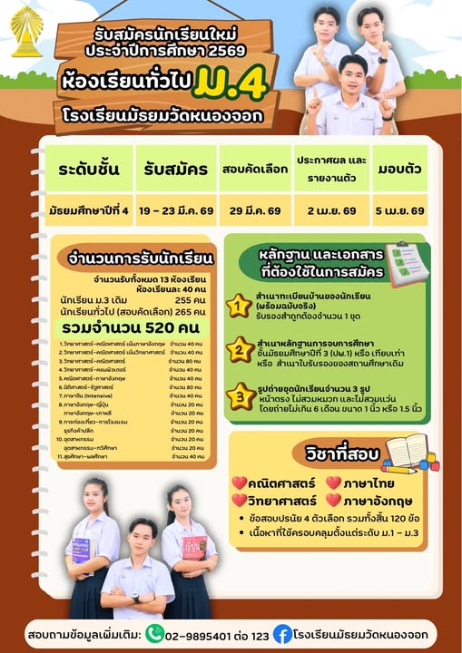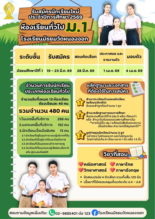 กำหนดการรับสมัครสอบเข้า ม.1 และ ม.4 ปีการศึกษา 2569 - โรงเรียนมัธยมวัดหนองจอก