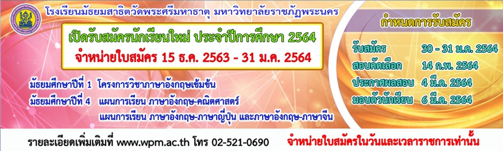 ดูรายละเอียดเพิ่มเติมได้ที่ : โรงเรียนมัธยมสาธิตวัดพระศรีมหาธาตุ มหาวิทยาลัยราชภัฏพระนคร – WatPhrasrimahadhat Secondary Demonstration School (wpm.ac.th)