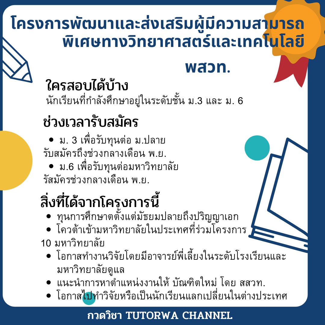ทุนนี้เหมาะกับคนรักคณิตศาสตร์เเละวิทยาศาสตร์ เพราะเป็นการให้ทุนการศึกษาตั้งเเต่มัธยมปลาย จนถึงปริญญาเอก เเละยังเปิดโอกาสให้ได้เรียนรู้การทดลอง, การทำงานวิจัย ผ่านค่ายย่อยต่างๆ ภายในโครงการ