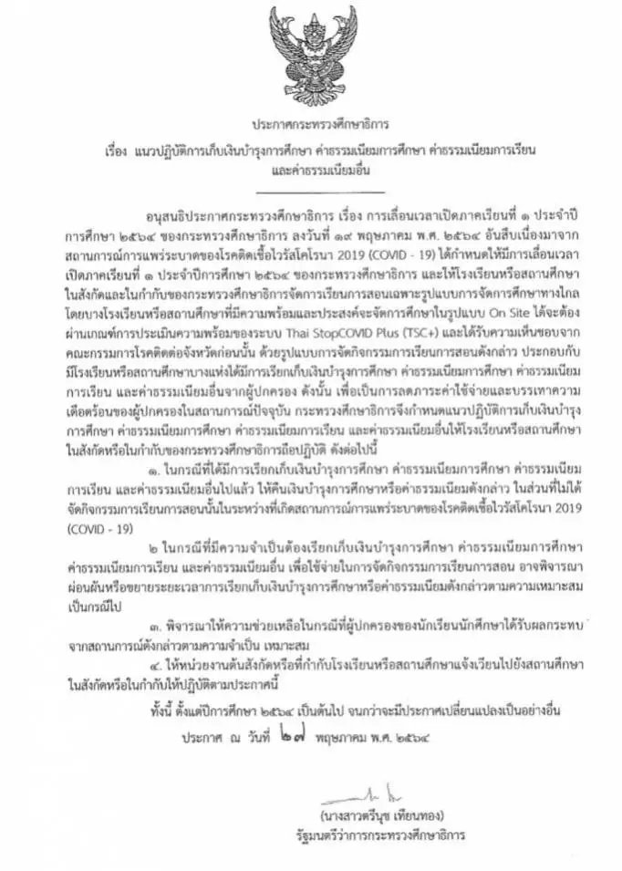 รมว.ศธ. "ตรีนุช เทียนทอง" ออกประกาศ ช่วยผู้ปกครอง พิษโควิด-19 เดือดร้อนหนัก ให้ คืน ลด ผ่อน ค่าเทอม ค่าบำรุง