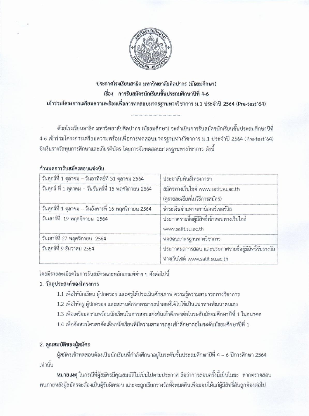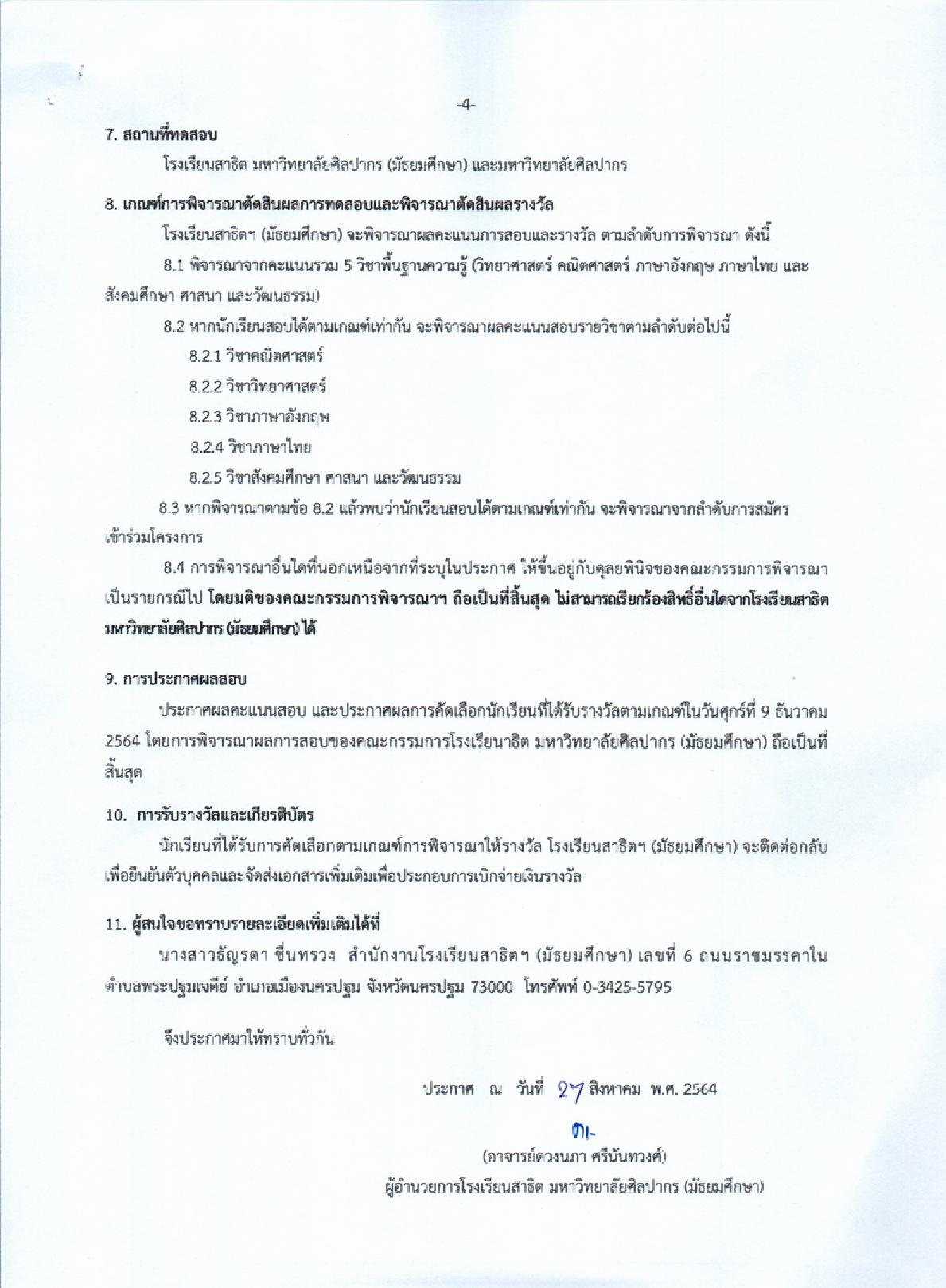 | วันศุกร์ ที่ 9 ธันวาคม 2564 | ประกาศผลสอบ และประกาศรายชื่อผู้มีสิทธิ์รับรางวัลทางเว็บไซต์ www.satit.su.ac.th |