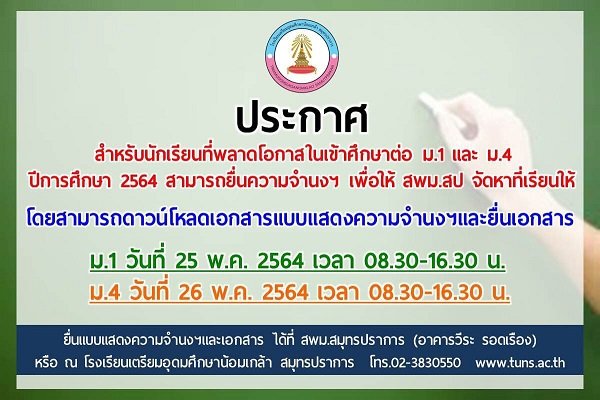 ผู้ปกครองและนักเรียนสามารถยื่นความจำนงสำหรับนักเรียนที่ยังไม่มีที่เรียน ณ ศูนย์ประสานงานการรับนักเรียน ของสำนักงานเขตพื้นที่การศึกษาทุกเขต ได้ตั้งแต่วันที่ 2 – 5 เมษายน 2565 โดยสำนักงานเขตพื้นที่การศึกษา (สพท.) จะจัดสรรที่เรียนให้ในโรงเรียนที่ยังไม่เต็มแผนการรับนักเรียน