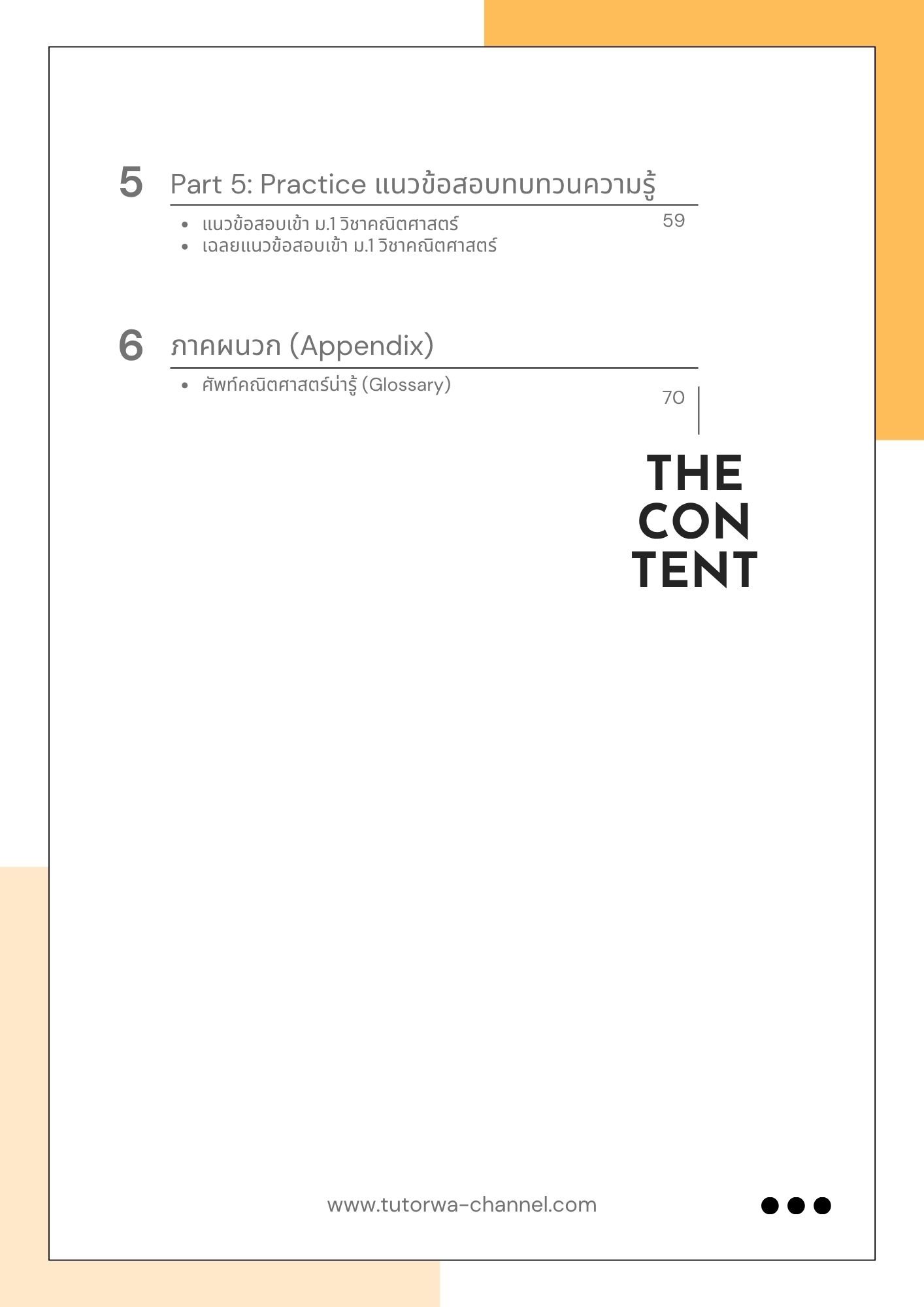 หัวใจของหนังสือเล่มนี้ คือการสกัดเอาเฉพาะ "แก่น" ของวิชาคณิตศาสตร์ที่จำเป็นจริงๆ จากเนื้อหา ป.4-ป.6 มาสรุปให้นักเรียนเข้าใจได้ง่ายที่สุด แต่ครูรู้ดีว่าในสนามสอบจริงมักจะมีโจทย์ปัญหาที่ซับซ้อนและประยุกต์เกินกว่าที่เราเรียนในห้องเรียนเสมอ ดังนั้น ในเล่มนี้ครูจึงได้เพิ่มเติมเนื้อหาและเทคนิคสำคัญของระดับชั้น ม.ต้น ที่มักถูกนำมาออกข้อสอบบ่อยๆ เพื่อให้นักเรียนได้เห็นภาพรวมที่กว้างขึ้น และสร้างความได้เปรียบในสนามสอบจริง